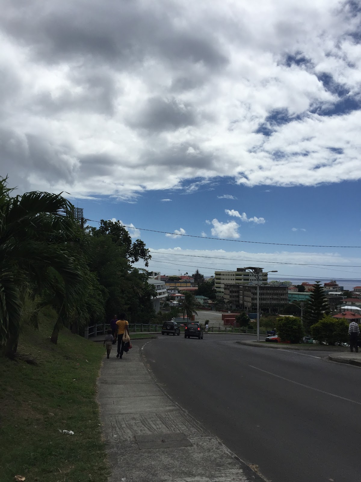 Ohjelmassa oli siis parinkymmenen minuutin vaellus Portsmouthin näköalapaikalle. Eka vaellus meillä täällä Dominicalla! Vaikka matka ei pitkä ollutkaan nii kyllä siinä lämmin tuli ja syke nousi, kun matka oli koko ajan nousevaa, juurikkoista polkua. Huikeet oli maisemat ylhäältä! Koska sää oli kirkas, nähtiin myös hyvin naapurivaltio, Guadeloupe. Aika lähellä nää saaret ovat siis toisiaan. Takasin tullessa piti varoo, ettei vaan kompastu juuriin ja kiviin.