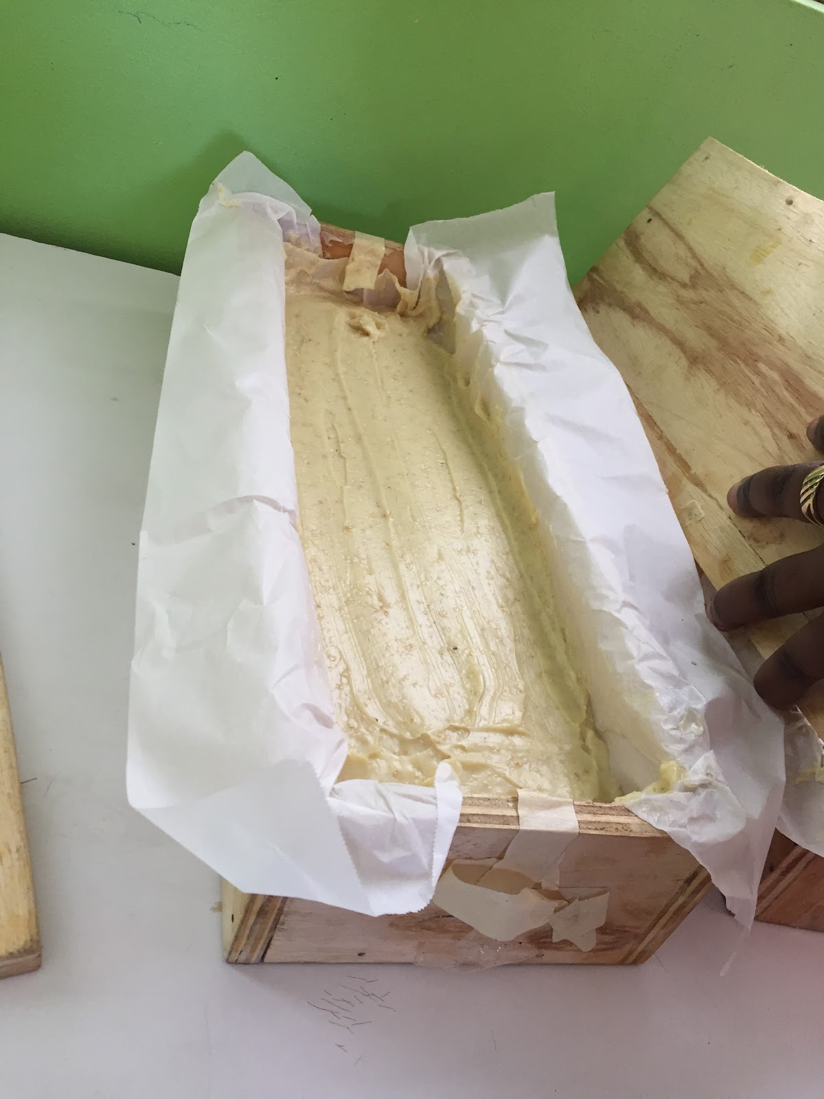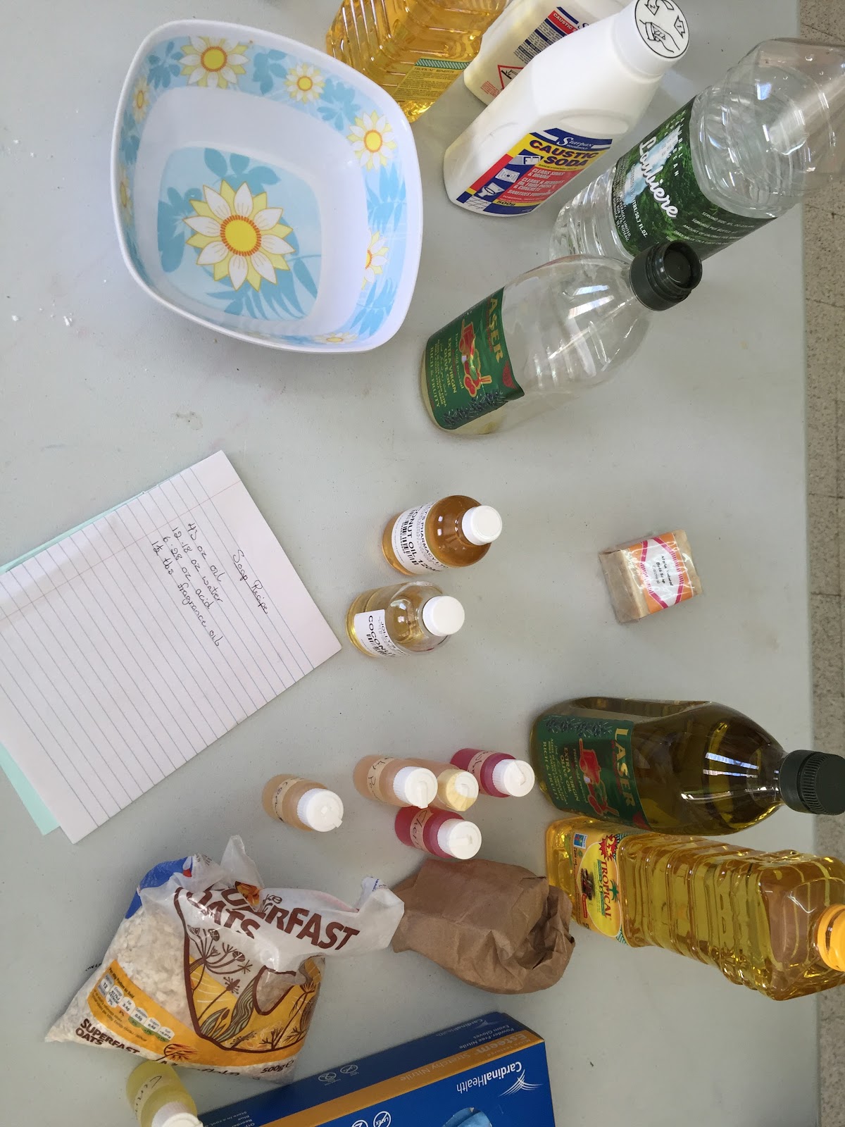 Viime perjantaina tehtiin saippuaa. Eräs opettajista oli puhunnu siitä jo aiemmin viikolla, mutta olin kuullut soapin sijasta soup, eli keitto... Aamulla näin yhden oppilaan repivän kasvin lehtiä pahvilaatikkoon ja kysyin mihin ne on tulossa. Oppilas sanoi, että se selviää kun menen katsomaan koulun saliin, mitä valmisteluja siellä tehdään. Oletin siis koko ajan että kyse on nyt sitte jostain nokkoskeiton tapasesta jutusta.. Olisitte nähny miun ilmeen ku menin saliin ja pöydällä oli vaan öljyä, vettä, jotain pieniä pulloja ja syövyttävää ainetta :D Hetken siinä mietin et tätä keittoa en kyl haluu maistaa, mut sitte tuli maalaisjärki esiin ja tajusin mistä on kyse.