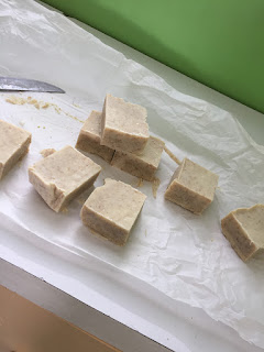 Alla olevissa kuvissa vasemmalla juuri tehtyä saippuaa, jonka täytyy antaa olla 3 viikkoa tuollaisessa puulaatikossa kansi päällä. Oikealla valmista saippuaa.